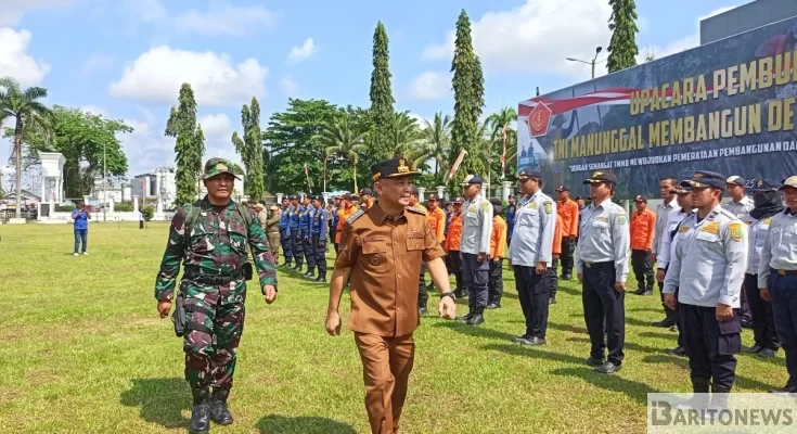 Buntok – Bupati Barito Selatan (Barsel), Kalimantan Tengah (Kalteng), Eddy Raya Samsuri memimpin Apel Pembukaan TNI Manunggal Membangun Desa (TMMD) Reguler ke-124 di halaman Kantor Bupati setempat, Selasa (6/5).