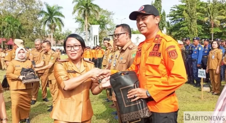 Dalam acara tersebut, Ita Minarni juga menyerahkan bingkisan Hari Raya secara simbolis kepada salah satu pegawai BPBD Barsel sebagai bentuk perhatian dan kepedulian antarpegawai.