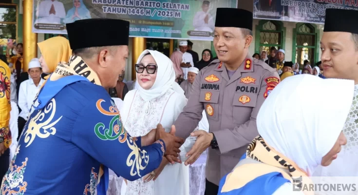Buntok – Kapolres Barito Selatan (Barsel), Kalimantan Tengah (Kalteng), AKBP Jecson R Hutapea memimpin langsung pengamanan pemberangkatan jemaah haji tahun 2025 yang berlangsung di Halaman Masjid Agung Baiturahman Buntok, Sabtu (10/5).