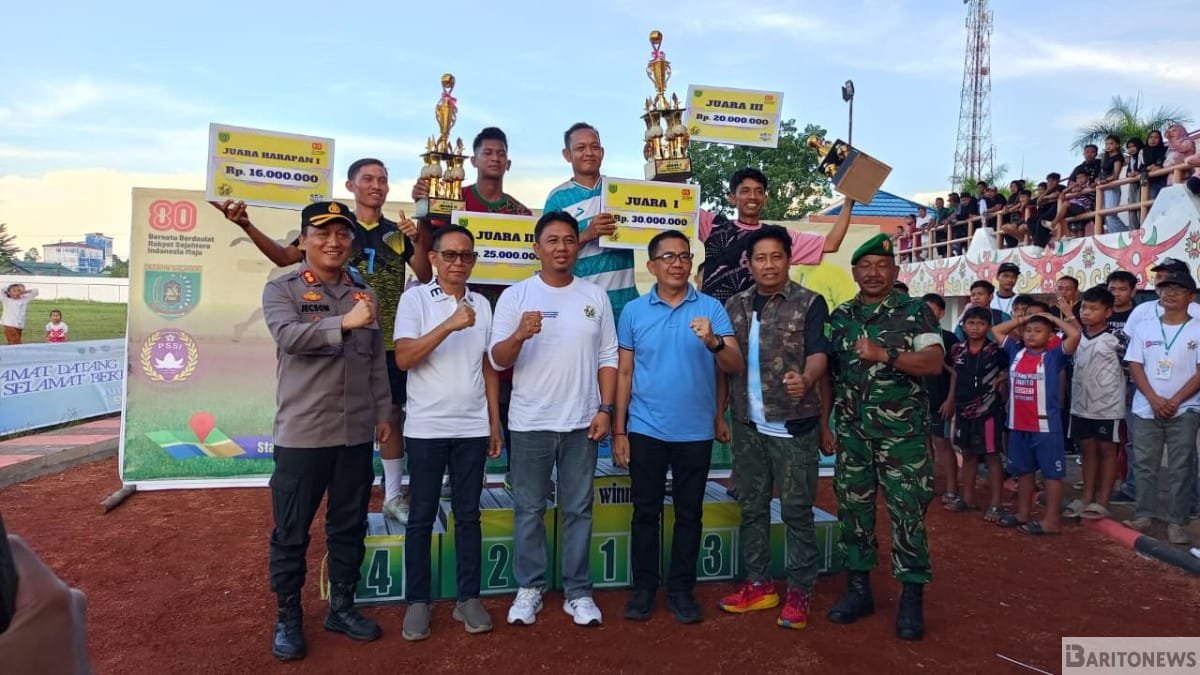 BUNTOK (BNews) – PS Karau Kuala FC berhasil keluar sebagai juara pertama Turnamen Sepak Bola Bupati Cup 2025 setelah menundukkan PS Bintang Muda Barito FC dengan skor 2–0 pada partai final yang berlangsung di Lapangan Batuah Buntok, Jumat (22/8).