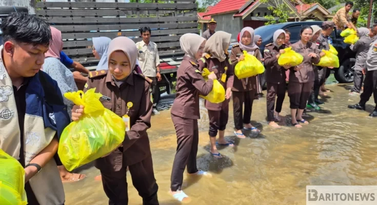 Buntok – Kejaksaan Negeri (Kejari) Barito Selatan (Barsel), Kalimantan Tengah (Kalteng) menyalurkan bantuan sembako kepada warga terdampak banjir di kawasan Jl. Padat Karya, Buntok, Kamis (24/4).