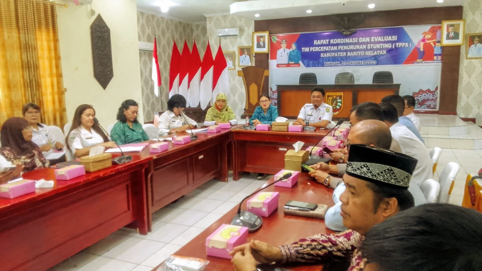 BNews. Buntok – Pemkab Barsel melalui Dinas Pengendalian Penduduk Keluarga Berencana Pemberdayaan Perempuan dan Perlindungan Anak (DPPKBP3A) Barsel melaksanakan rapat koordinasi dan evaluasi tim percepatan penurunan stunting (TPPS) di Aula Serbaguna Setda Barsel, Kamis, 25 Oktober 2023.