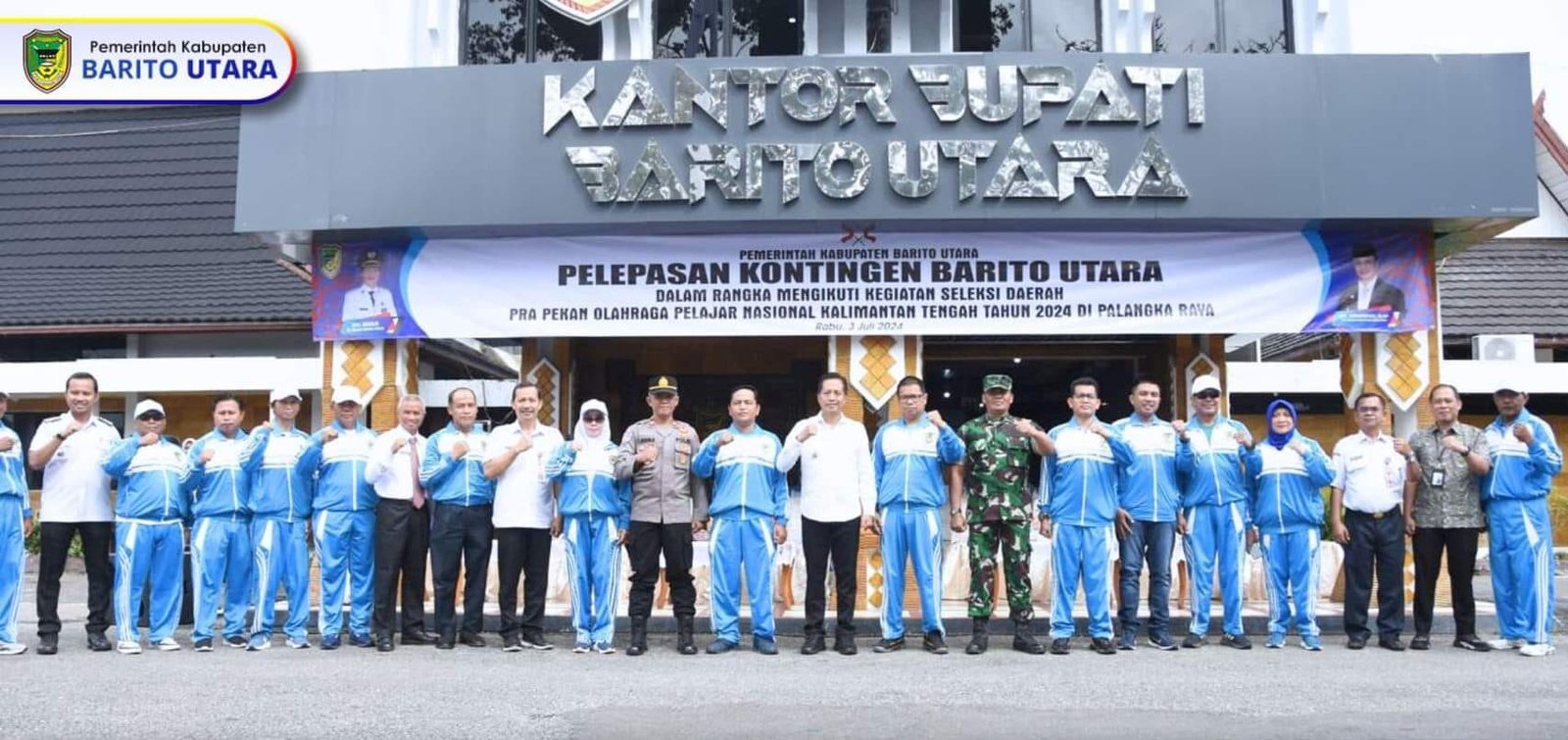 MUARA TEWEH – Pj Bupati Barito Utara Drs. Muhlis secara resmi melepas kontingen Kabupaten Barito Utara yang akan berlaga pada ajang seleksi Pra-Pekan Olahraga Pelajar Nasional (Pra-Popnas) Tahun 2024 tingkat Provinsi Kalimantan Tengah. Kegiatan ini dilaksanakan di halaman Kantor Bupati Barito Utara dan dihadiri oleh unsur FKPD, Asisten Setda, Staf Ahli Bupati, Kepala Perangkat Daerah, Camat, dan undangan terkait lainnya, Pada 3 Juli 2024.