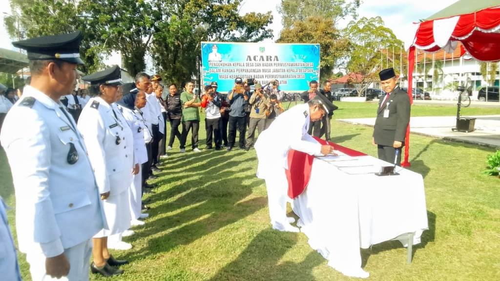 BNews. Buntok – Pj. Bupati Barito Selatan mengukuhkan perpanjangan masa jabatan 2 tahun Kepala Desa dan Badan Permusyawaratan Desa (BPD) se Barito Selatan. Ada sebanyak 79 kepala desa dan 86 Ketua dan anggota BPD se Barito Selatan yang dikukuhkan. di halaman Kantor Bupati Barito Selatan, Jumat (21/6).