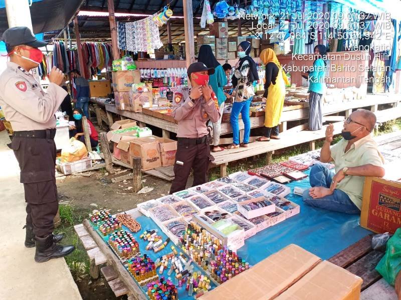 Baritonews, BUNTOK – Dalam rangka untuk mencegah penyebaran virus corona atau Covid-19 khususnya di wilayah hukum Polsek Dusun Hilir (Dushil) Polres Barito Selatan, personel Polsek Dushil menggelar patroli dengan menyambangi pasar untuk mengajak masyarakat yang beraktifitas agar senantiasa menerapkan protokol kesehatan, Selasa (21/7).