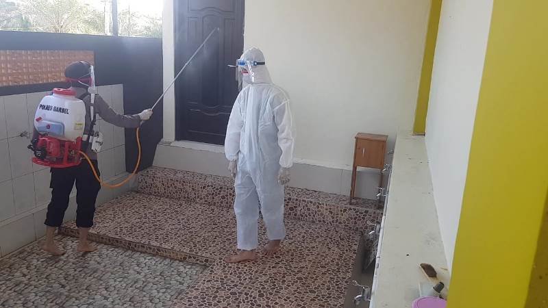 Terlihat Aipda Septiria bersama Bripka Yuli menyemprotkan cairan disinfektan dengan alat semprot solo dan menggunakan APD (Alat Pelindung Diri) lalu dilanjutkan dengan mengepel dan membersihkan area sekitar masjid.