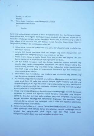 Dimana petisi tersebut yang intinya adalah menolak rencana Pemerintah Kabupaten Barito Selatan khususnya gugus tugas yang akan menjadikan asrama balai latihan kerja (BLK) di Kelurahan Jelapat sebagai tempat isolasi atau rumah singgah pasien virus corona atau covid19.