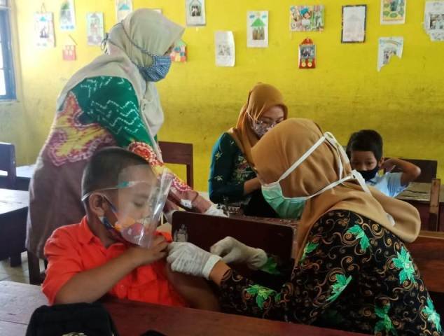 Berlokasi di ruang kelas sekolah, petugas Puskesmas Jaar dengan pakaian sesuai dengan protokol kesehatan memberikan imunisasi campak kepada murid MIN-1 Bartim yang datang begitu juga bagi orang tua dan siswa di wajibkan dengan menerapkan protokol kesehatan Covid-19 saat datang ke sekolahan.