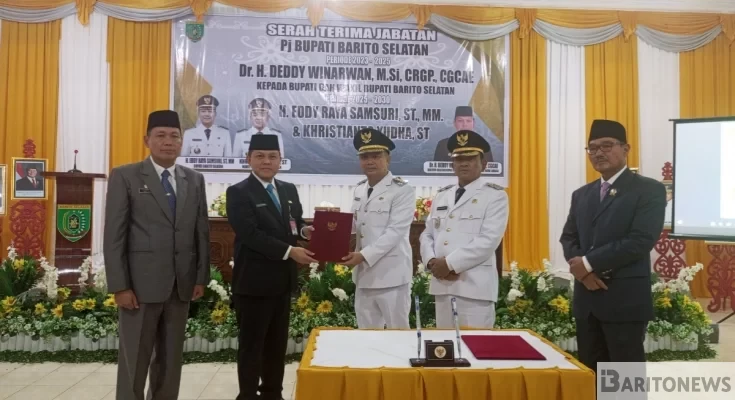 Buntok – Pemerintah Kabupaten (Pemkab) Barito Selatan (Barsel), Kalimantan Tengah, menggelar Serah Terima Jabatan (Sertijab) dari Penjabat (Pj) Bupati Barsel, Deddy Winarwan, kepada Bupati dan Wakil Bupati terpilih, Eddy Raya Samsuri – Khristianto Yudha.